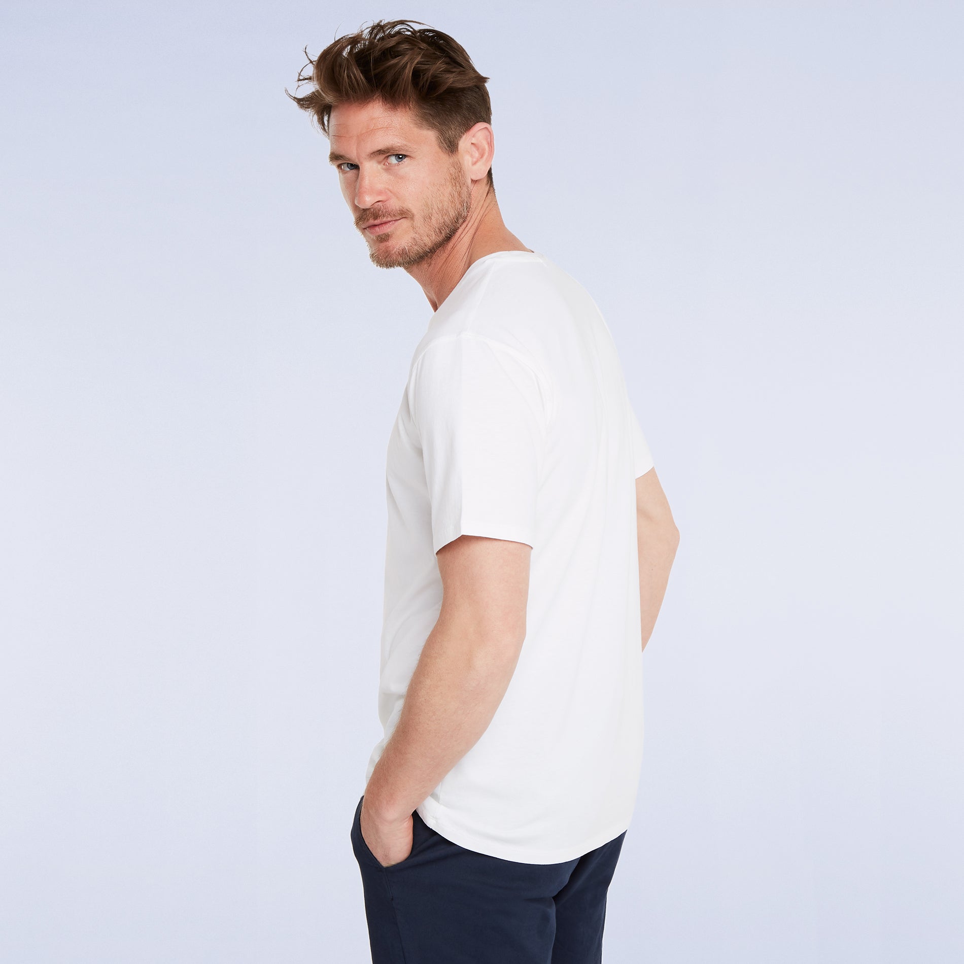 Hvis du passer en slim fit i vores skjorter, bruger du samme størelse i vores t-shirts. Hvis du bruger regular fit i vores skjorter, anbefaler vi at vælge en størrelse større.